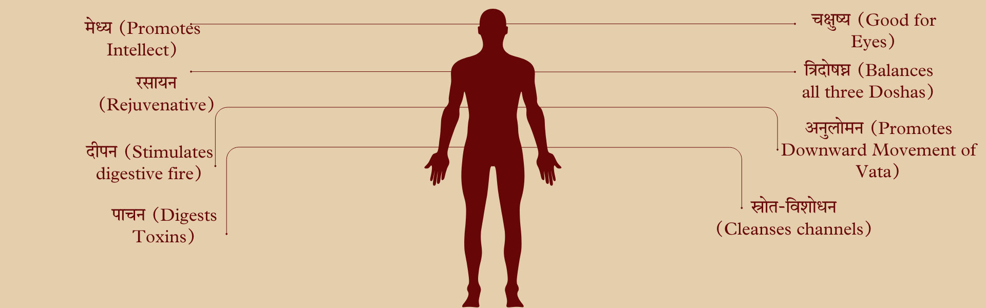 1. त्रिदोषघ्न (Balances all three Doshas) - तीनों दोषों को शांत करने वाली, वात, पित्त और कफ तीनों को संतुलित करती है।